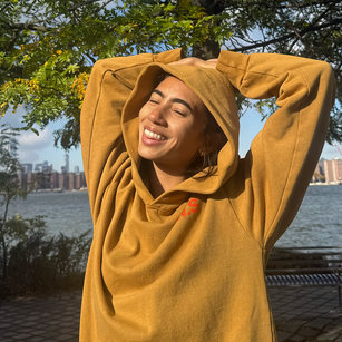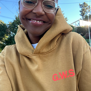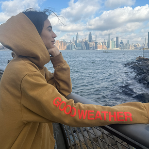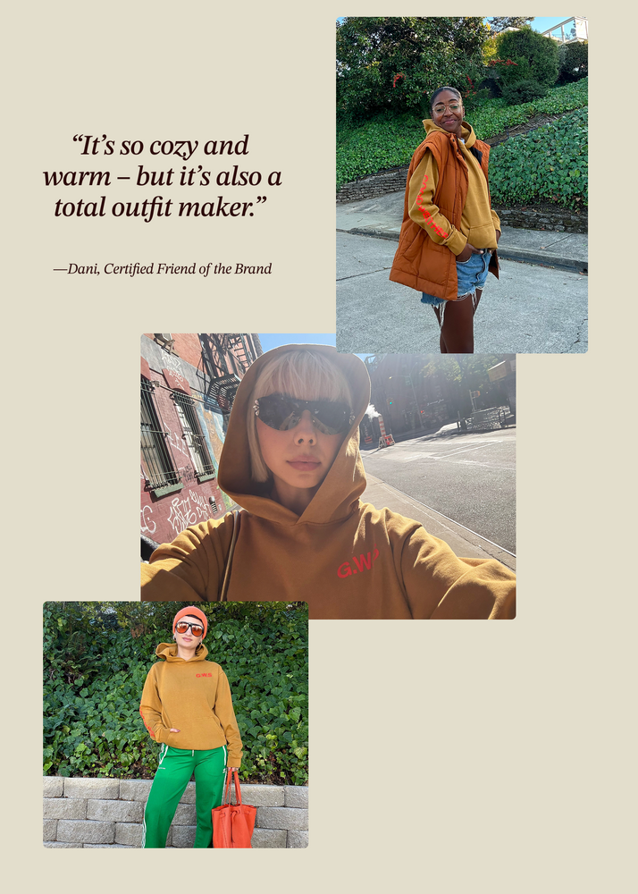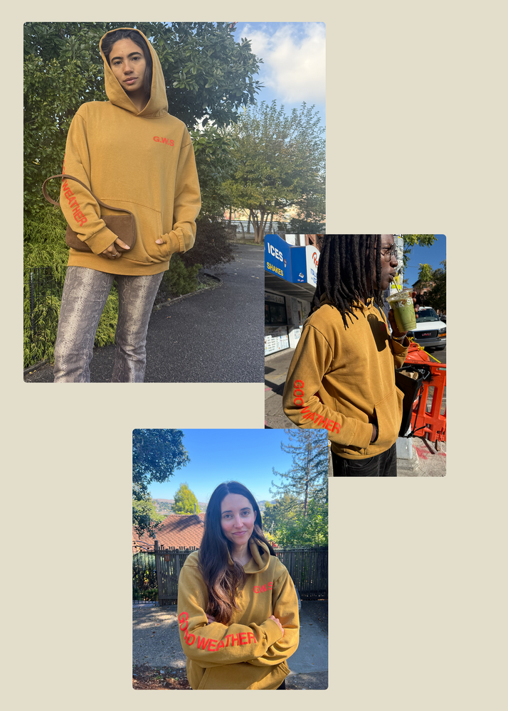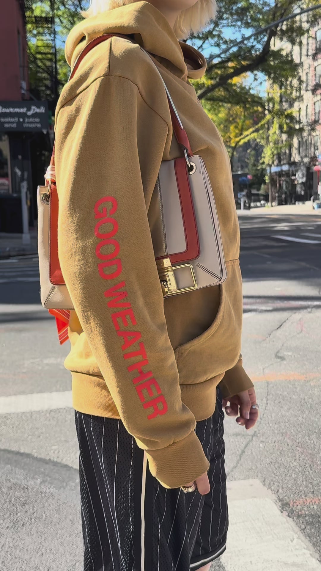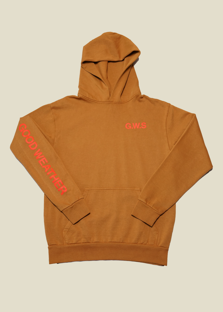 A super cozy and stylish oversized hoodie featuring a G.W.S chest print and Good Weather arm print, both in the brand's signature Hot Orange. The color is a rich cross between tan and mustard and the hood is everything: voluminous and with enough structure to hold its shape.